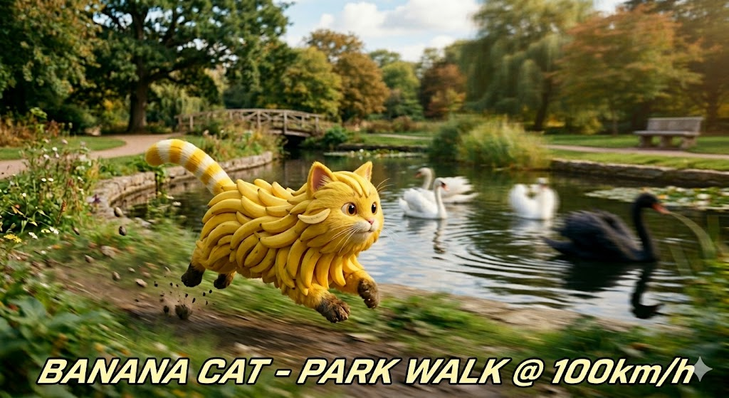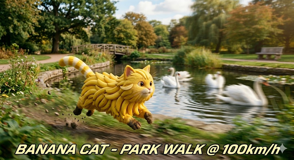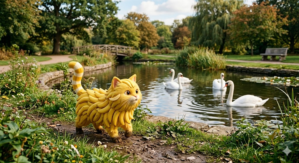 完全オリジナルの3Dアニメ調の毛がバナナで出来ている面白い猫(被写体)が白鳥のいる公園(状況)にいるイラスト。リアル調で(画風)。